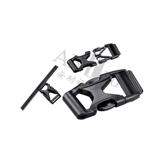 由POM材料公扣、母扣、橡胶骨形组件组成。公扣设有异形导舌及锁紧结构,母扣则设有相应异形卡槽及胶骨加强筋。舌片插入异型卡槽,橡胶骨辅助抗扭。兼容20mm编织带穿透,在独特结构下实现稳定连接和抗扭转功能组合。